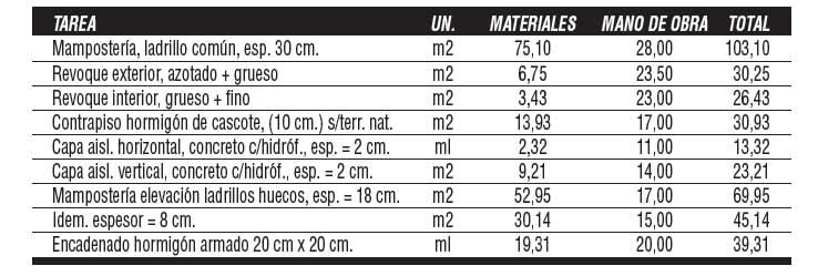Se publican en estas tablas los costos de una serie de tareas básicas de construcción. Para el cálculo de los materiales se tomó como referencia los cómputos que figuran en el libro “Cómputos y Presupuestos”, de Mario E. Chandías. Los valores de materiales y los costos de mano de obra son los que se publican en la presente edición, en sus respectivas secciones, y se toma como fecha cierre de la presente edición el 02/06/08.