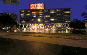 Aunque suene llamativo, el conjunto habitacional pensado para personas mayores se inspiró en la generación hippie de la década del '60, a través de la propuesta de un bloque de departamentos colorido y lúdico. El edificio dispone de una torre vertical que se eleva 11 metros sobre el piso, la cual se articula con un volumen horizontal. El conjunto se sitúa sobre un espejo de agua.