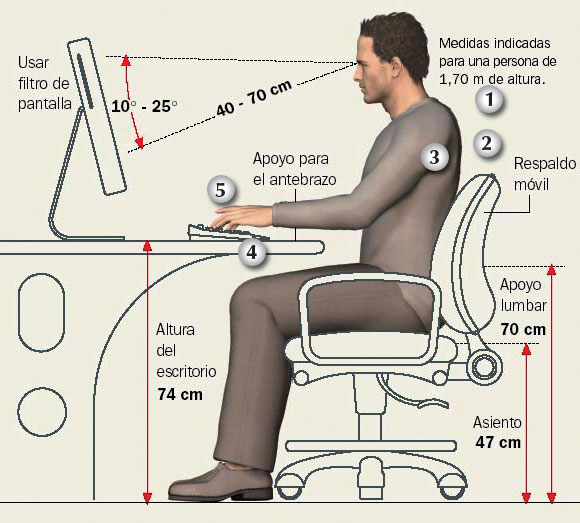 Es evidente que en muchas ocasiones estos problemas se deben, sobre todo, a las reducidas dimensiones de la mesa o a la falta de espacio debajo, lo que obliga al trabajador a sentarse en una zona restringida de la mesa. En otros muchos casos, sin embargo, es relativamente fácil mejorar la comodidad mientras se trabaja colocando la PC de forma adecuada.
