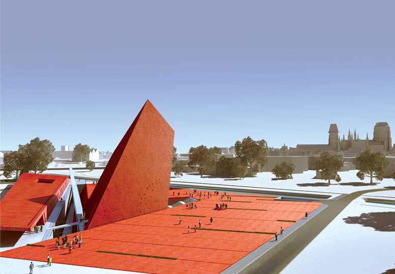El edificio busca convertirse en un icono de la ciudad, rodeado de los principales elementos históricos. Dinámico y enorme, el proyecto se configura como una gran escultura, elevándose desde la tierra, orientado por la luz. Simple y desnudo, se coloca simbólicamente en la geometría de los astilleros, vinculando la tierra (la huella del pasado) con el cielo (la esperanza y el futuro). “El proyecto acumula emociones, retrata el terror de la guerra sin privarnos de la esperanza”, señalaron sus creadores.