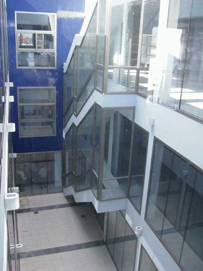 Los patios poseen cerramientos acristalados de piso a techo para permitir iluminación y ventilación permanente a los distintos ambientes de trabajo.