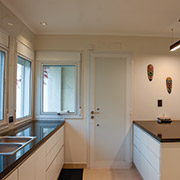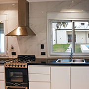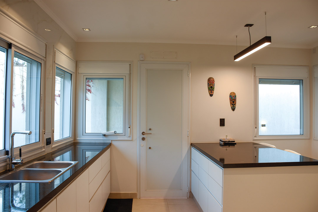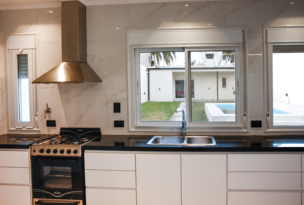 En cuanto a terminaciones, los muros exteriores están revestidos con texturado plástico, además se realizaron algunos detalles en piedra; las carpinterías son de aluminio blanco, rejas y portón en hierro blanco. En el interior pisos flotantes y de porcelanato, revestimientos cerámicos, bajo mesadas en melamina y mesadas de granito. El diseño de la iluminación le da identidad a la casa, con embutidos para la iluminación general, y colgantes y tiras led para los sectores a destacar.