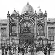 Una escalera de hierro y madera llevaba a la entrada. En el frente se ubicaba una enorme cúpula, flanqueada por otras cuatro más pequeñas. Todas revestidas de cristal e iluminadas por luz eléctrica. Más de novecientos puntos de luz daban al palacio un aspecto imponente.