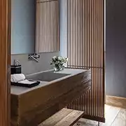 La madera es apreciada por su capacidad para graficar la tranquilidad que se asocia con la naturaleza. Este material infunde en el baño una sensación de paz y calidez, conectando el espacio con la serenidad de los bosques. Aunque en el pasado era raro ver madera en los baños debido a problemas de humedad, las nuevas técnicas de tratamiento y sellado solucionaron estos inconvenientes, y permitieron el uso del material, por ejemplo, en bañeras, muebles y mamparas.
